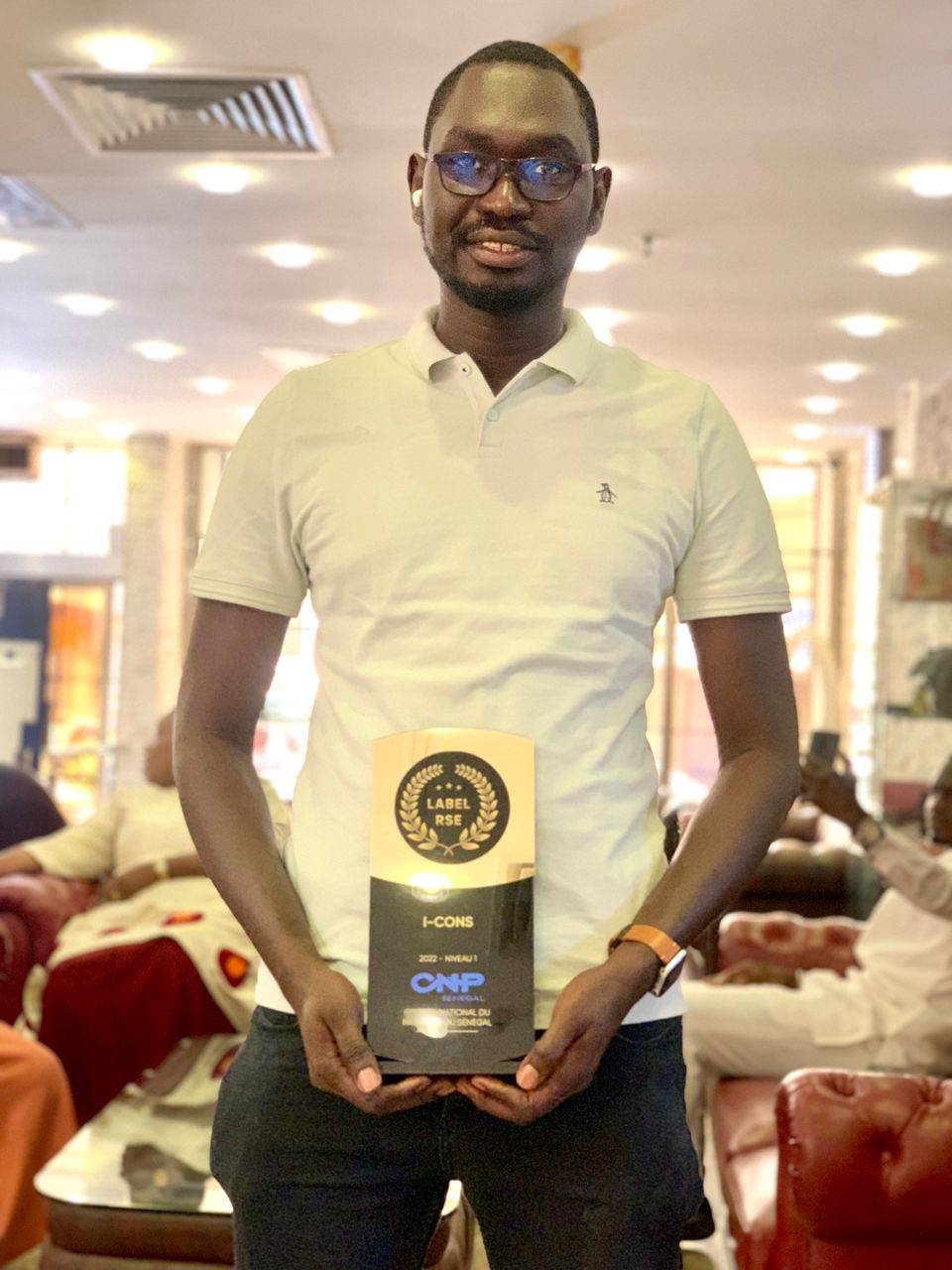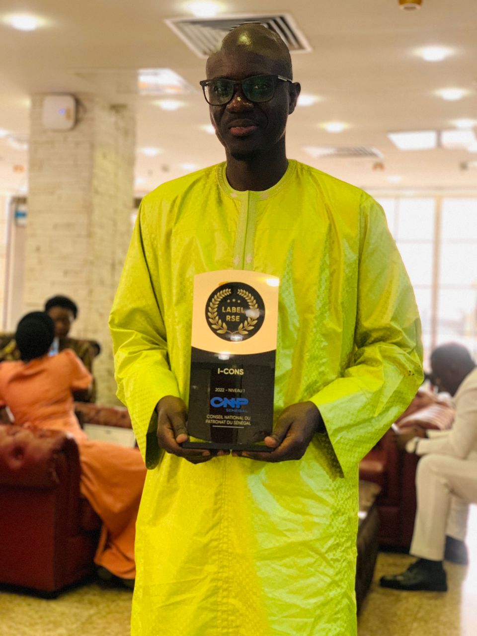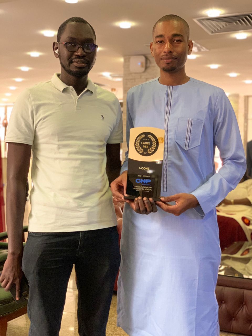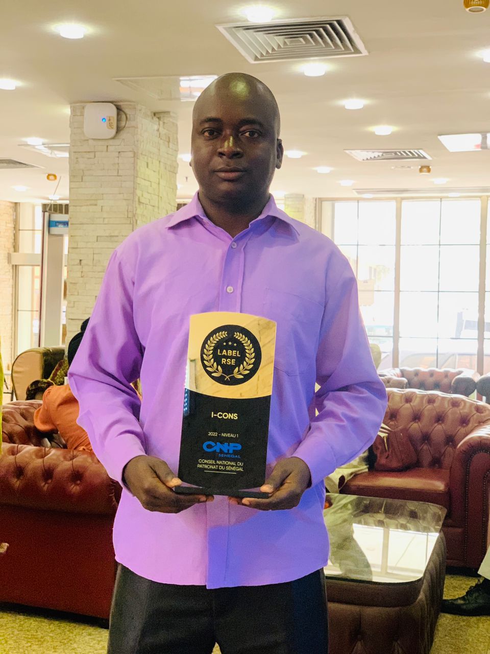 Le Directeur Général de I-CONS Monsieur Tamsir AGNE a reçu ce jour des mains du Ministre du Travail et du Dialogue Social, le Label RSE - CNP qui consacre l’engagement de l’entreprise dans l’implémentation d’une stratégie RSE et développement durable, mais également qui prend en compte les besoins et attentes des parties prenantes ainsi que les enjeux prioritaires du groupe.